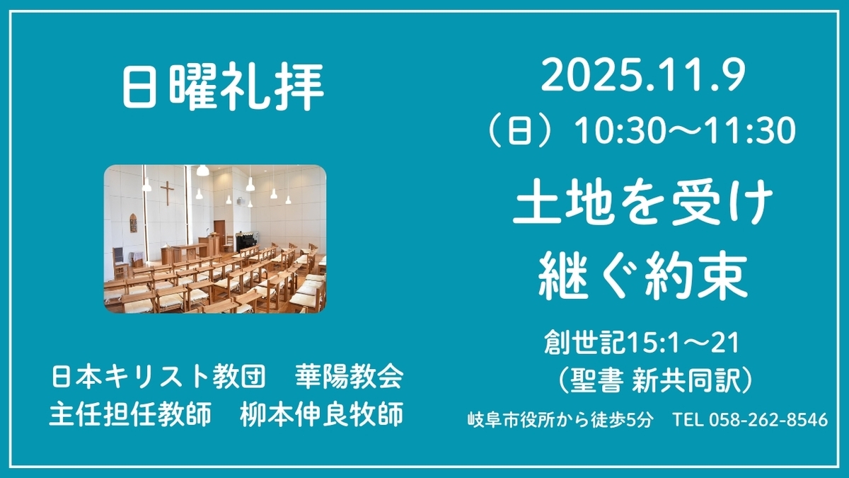 聖書の言葉を聞きましょう。創世記15:1〜21を朗読します。会衆席にある旧約聖書19頁です。普段は、新共同訳と聖書協会共同訳を朗読していますが、今回は箇所が長いので新共同訳のみ朗読します。